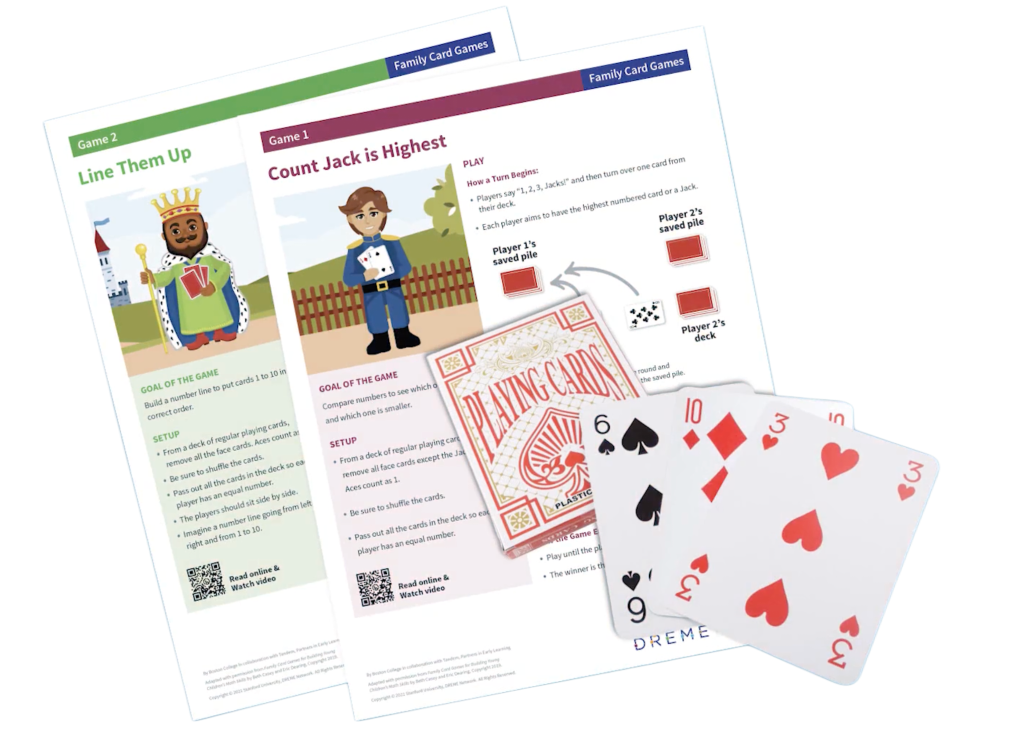 DREME’s Family Math Kits contains many activities designed to be playful, low-pressure, and implement children’s everyday lives. Take the Line Them Up game included in the Counting Math Kit as an example. Children use a deck of playing cards, an object that they already associate with playtime, to practice their counting skills—they can even play with other children! By creating a low-stakes, familiar, and joyful environment, students can develop their emotional self-regulation skills while practicing math.